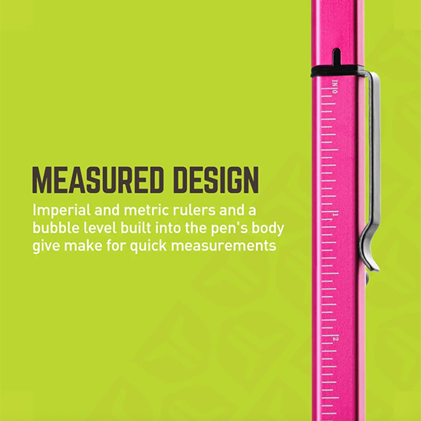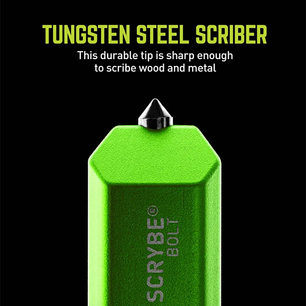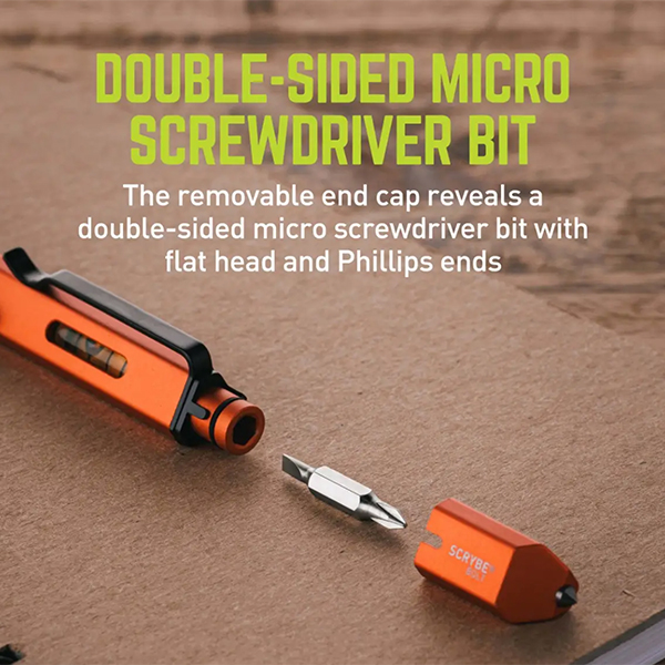The SCRYBE BOLT 8-in-1 Multi-Tool Pen features a ballpoint pen with bolt-action deployment, rulers, bubble level, 2 micro screwdrivers housed within a removable Tungsten steel tip that serves as a glass breaker, scribe, and box opener. With its unique triangular design and 3-position adjustable clip, the SCRYBE BOLT delivers a customizable writing experience with a variety of easily accessible tools.